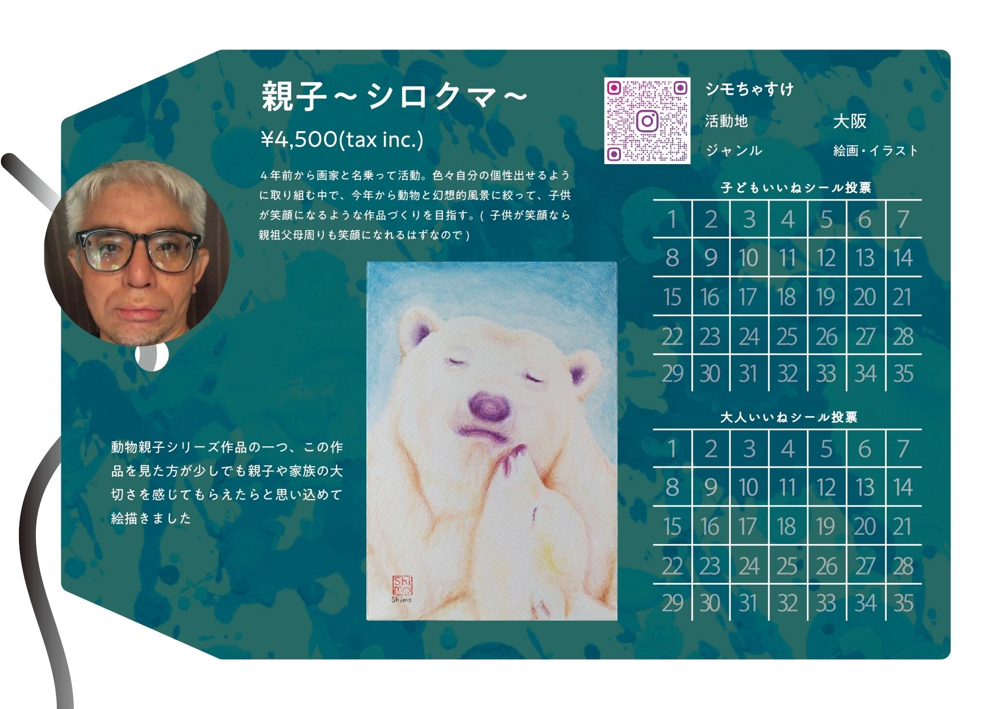 動物親子シリーズ作品の一つ、この作品を見た方が少しでも親子や家族の大切さを感じてもらえたらと思い込めて絵描きました